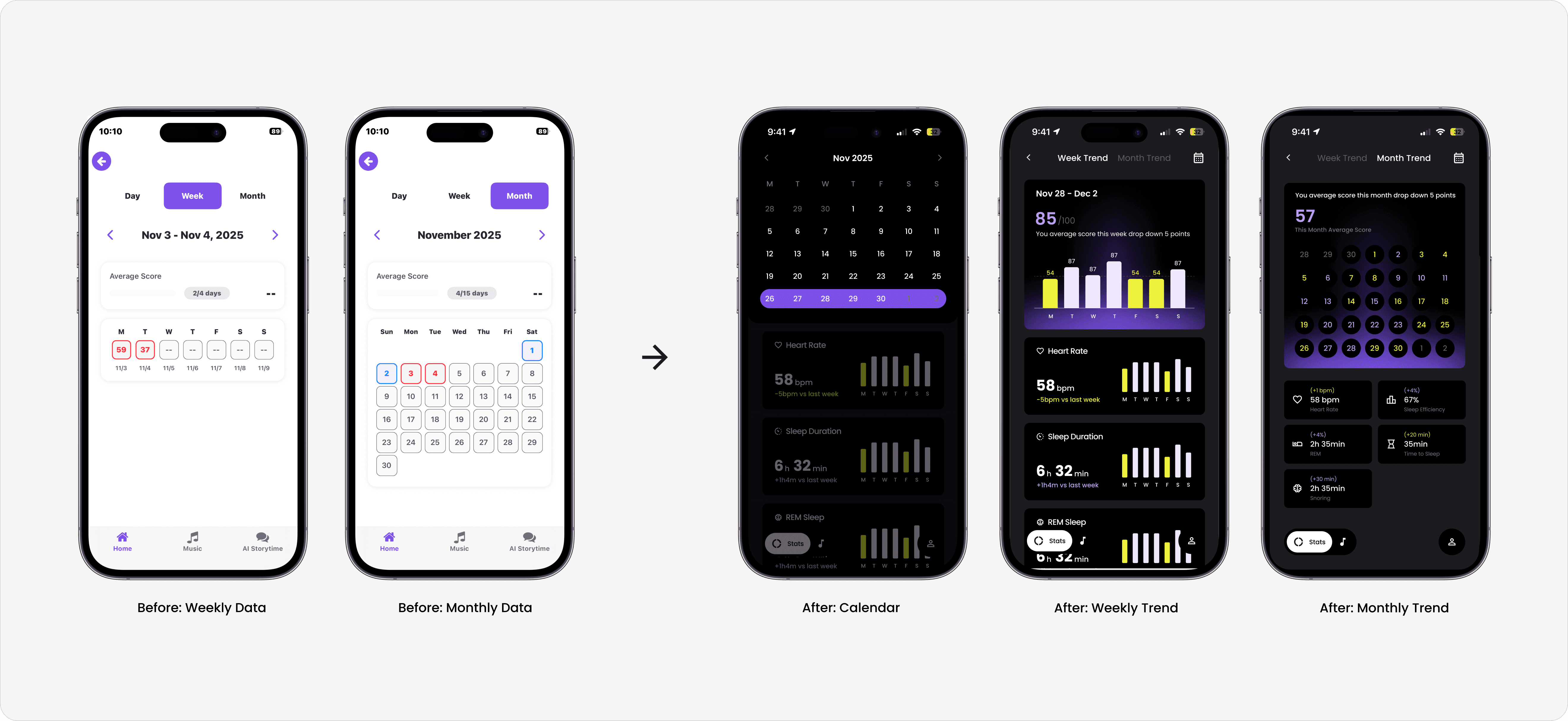 Have a weekly and monthly summary that compares different sleep metrics in a visualized way