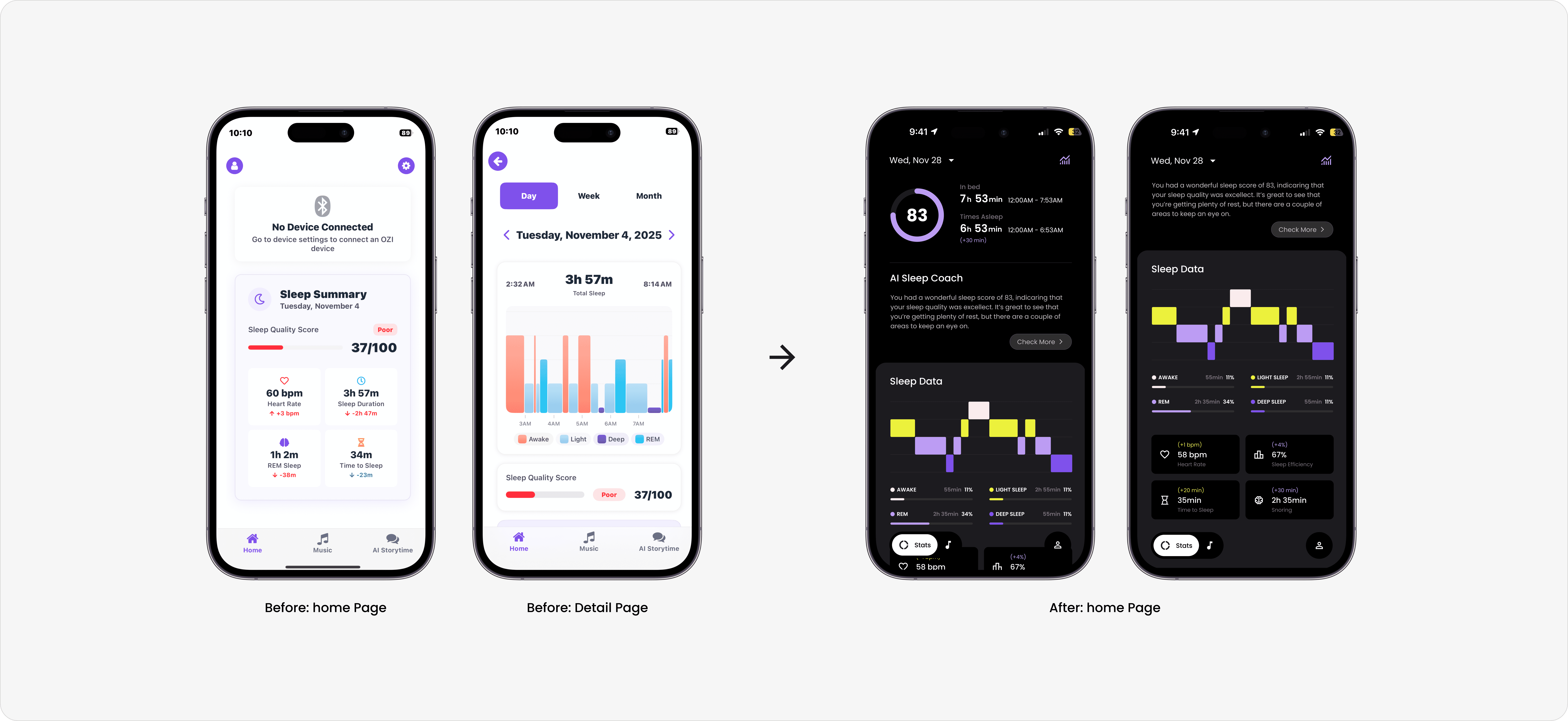 The OZI Sleep mobile app is designed for parents monitoring their children’s sleep and for elderly users tracking their own sleep stages via a smart bedframe. However, the current app can’t effectively communicate essential information due to a complex information architecture.